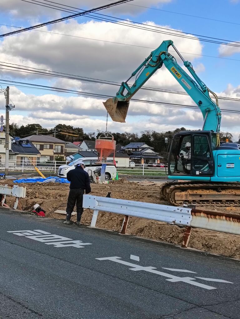 生コンクリートを 局所的に流し込むのに 重機に吊り下げられた漏斗めいた器体が使われるのが興味深く しばらく眺めていた