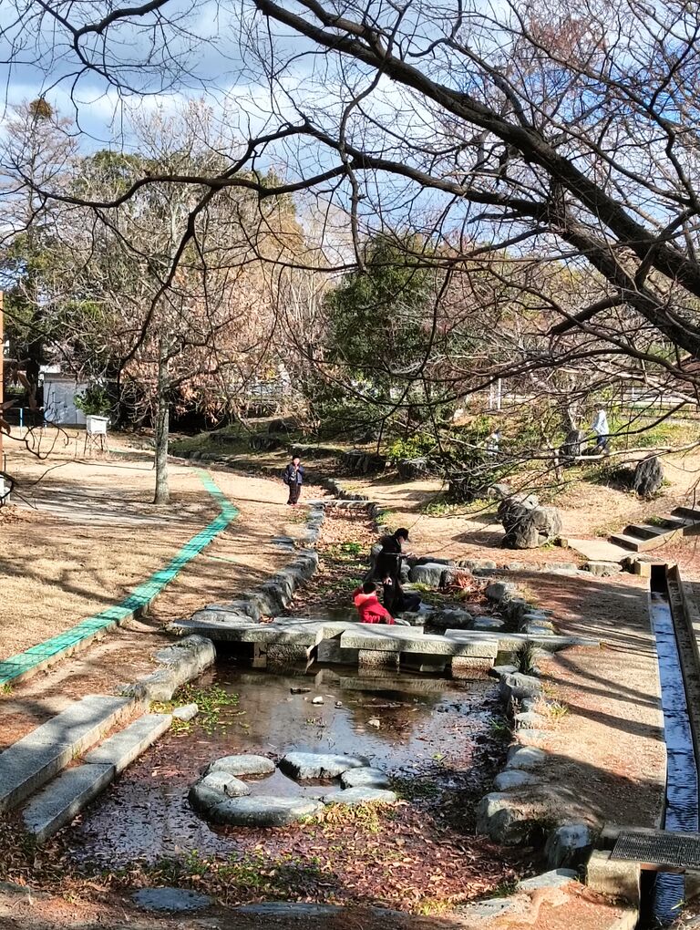お母さんが 池に泳ぐ鯉を指しながら バギーの乳児に 何かを話しておられた