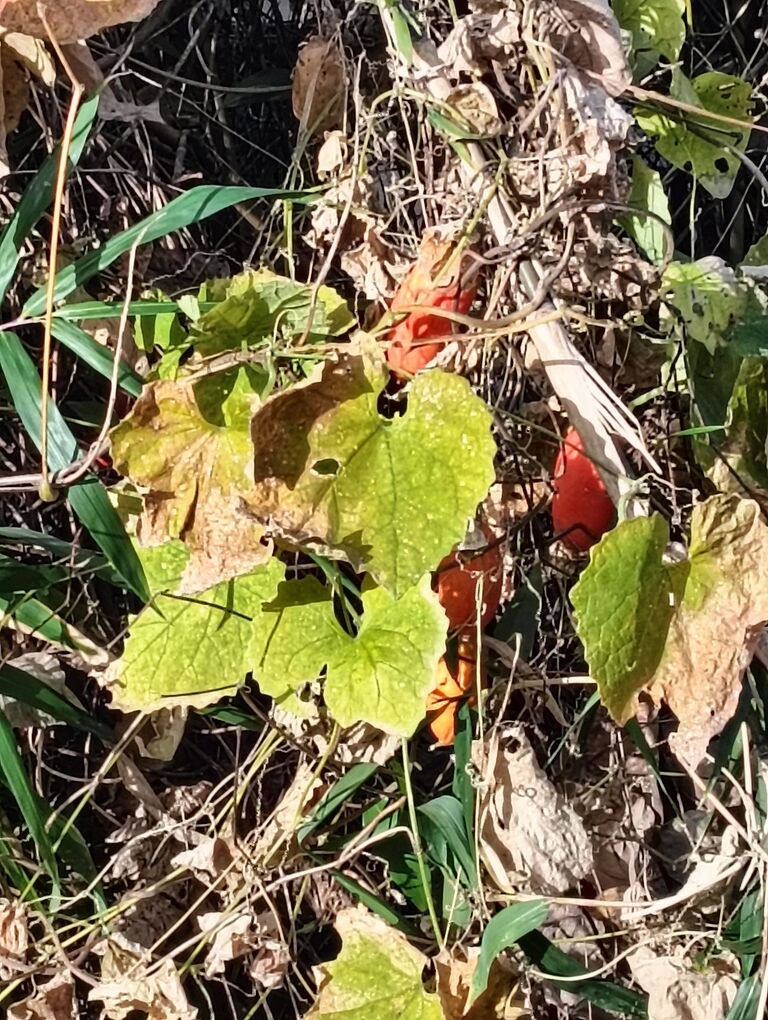 いさかか大振りな カラスウリの実が 朱赤を輝かせていた